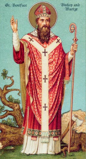 St. Boniface, a monk of Exeter in England, is one of the great figures of the Benedictine Order and of the monastic apostolate in the Middle Ages. Gregory II sent him to preach the Gospel in Germany. He evangelized Hesse, Saxony and Thuringia and became Archbishop of Mainz. He well earned the title of Apostle of Germany, and Catholic Germany in our own times still venerates him as its father in the faith. He was put to death by the Frisians at Dokkum in 754 during the last of his missionary journeys. The famous abbey of Fulda, where his body lies, has remained the national shrine of Catholic Germany.